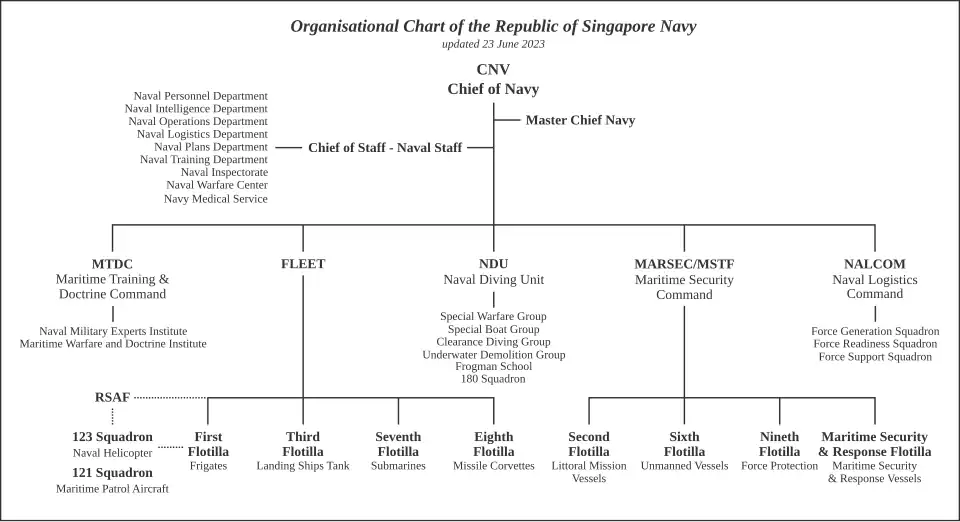 The Republic of Singapore Navy is led by the Chief of Navy (CNV), who reports directly to the Chief of Defence Force (CDF). The CNV is responsible for the RSN's overall operational capabilities and administration. The organisational chart shows the peacetime administrative chain of command with five formations: the Fleet, Maritime Security Command, Naval Engineering and Logistics Command, Naval Diving Unit, and the Maritime Training and Doctrine Command.[70][71]