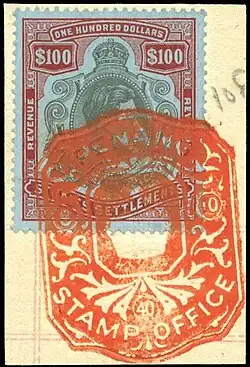The first revenue stamp issued in the Straits Settlements was an East India postage stamp overprinted S.S. in a diamond. Only about 20 copies are known to exist of this stamp, making it very rare. On 1 April 1867, the Settlements became a British Crown Colony and so Indian revenues were issued overprinted with a crown and a new value in cents. In 1874 a new issue portraying Queen Victoria, and this remained in use until the 1880s with minor changes in the perforation.[1][2]