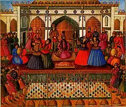 In January 1731, Reza Qoli married Fatemeh Begum in Mashhad. Nader made the effort to reach the city in time to attend the wedding.[7] The grand wedding celebrations, lasting for a week, were held in Chaharbagh gardens, outside of Mashhad. At the end of the celebrations, an auspicious planetary conjunction was observed in the sky. Then the attendance went to a hunting expedition around Abiward and welcomed Nowruz (Iranian new year) a few weeks later.[11] Nader set out to Herat on March 1731 to completely quell the Abdalis and returned victorious in February 1732.[12] On March 1734, concurrent with Nowruz, Fatemeh Begum gave birth to a son, whom Nader named Shahrokh, after Shah Rukh son of Timur, thus displaying his interest to emulate a conqueror on the scale of Timur.[7]