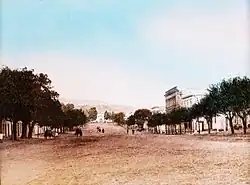 View of High Street looking west from the corner of Hill Street towards the Drostdy Arch, the main entrance to the present-day Rhodes University campus, c. 1898