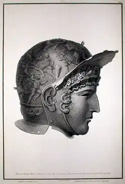 The helmet and other items were bought from Walton by Townley, who lived nearby at Towneley Hall. Townley was a well-known collector of Roman sculpture and antiquities, who had himself and his collection recorded in an oil painting by Johann Zoffany. Townley reported the details of the find in a detailed letter to the secretary of the Society of Antiquaries, intended for publication in the Society's Proceedings: it was his only publication.[3] The helmet, together with the rest of Townley's collection, was sold to the British Museum in 1814 by his cousin, Peregrine Edward Towneley, who had inherited the collection on Townley's death in 1805.[4]