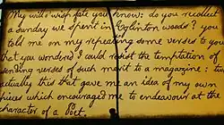 On 30 December 1787, Burns wrote to Brown saying: "Do you recollect a Sunday we spent in Eglinton woods? You told me, on my repeating some verses to you, that you wondered I could resist the temptation of sending verses of such merit to a magazine: 'twas actually this that gave me an idea of my own pieces which encouraged me to endeavour at the character of a Poet." Adding that : "Almighty Love still "reigns and revels" in my bosom; and I am at this moment ready to hang myself for a young Edinr. Widow." The widow, as he puts it, was Clarinda.[1] This letter provides clues as to when Burns's regular marriage to Jean Armour took place.
