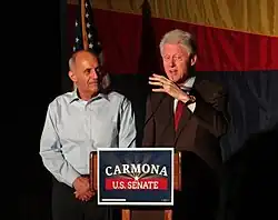 In August 2006, Carmona returned home to Tucson, Arizona.[2] In November 2011, he announced he would seek the Democratic Party's nomination for United States Senate in the hopes of succeeding outgoing Republican Senator Jon Kyl, despite being registered as a political independent.[3] He narrowly lost to Republican challenger Congressman Jeff Flake.[4]