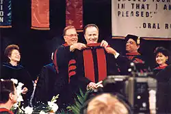 Roberts pushed the team to increase enrollment, tighten budgets and find additional revenue streams. At the same time, he used his television program to promote the university. He started the Adopt A Student scholarship campaign as one of these efforts, and embarked on other efforts to promote Christian education and increase enrollment.[32][33] Over the next four years, enrollment increased by 1,200 students and the university's debt shrank by 50 percent[34] Roberts used his ministry connections to help with recruitment, specifically in the African American community. Through his speaking at churches and conferences, he was mainly responsible for the 20% African American student body.[1] ORU receives the Racial Harmony Award from the Council for Christian Colleges and Universities in 2002.[35]