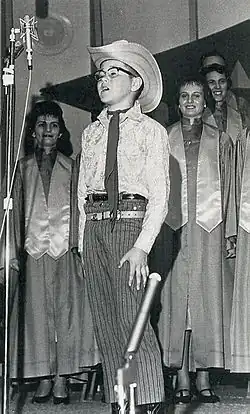 Though drawn to ministry, the attention his father drew made Roberts uncomfortable, leading to teasing at school. Roberts wrote, "I came home from school many a day with my shirt torn and my nose bloodied from being in fights with the other kids who made fun of me, my dad and the healing ministry of Jesus Christ."[4] As a teenager, with the negative press his father was receiving and pressure from his father to sing at crusades, he began to pull away from involvement with his father's ministry and began pursuing other talents and interests, such as singing.[5] Roberts learned to play the guitar and performed around Oklahoma, dreaming of a career as a nightclub singer in Las Vegas.[4] In 1966, he played the lead in his high school's production of The Sound of Music and was offered a scholarship to Interlochen.