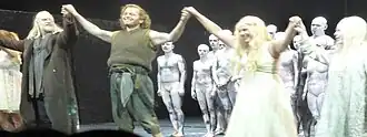 Modern costuming shown in closing bows following Götterdämmerung in 2013 at the Bavarian State Opera. Left to right: Gunther, the Rhinemaidens, Gutrune, Hagen, Brünnhilde, Siegfried