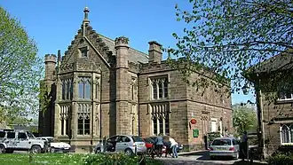 In the mid-19th century the lord of the manor, Sir William Amcotts-Ingilby, developed a plan to redevelop Ripley in the style of an Alsatian village; the final building in his plan was the town hall which he wanted to resemble a French "Hôtel de Ville".[2] The new building was designed in the Gothic Revival style, built in ashlar stone and was completed in late 1854.[1]