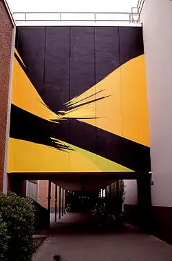 The couple left Los Angeles in 1969, alternating their time between New York and Toronto (which would continue until 1975)[15] when Toronto became her centre, the demand for her work increased. In New York, galleries were purchasing entire series' of 100 prints outright.[8] One day in 1971 someone suggested she might obtain a better effect on her long lines/rays if she used an airbrush; hesitant at first, she began using it more, then eventually used it all of the time. She found that airbrush brought her something new, something that neither oil, nor acrylic, nor the millions of lines she had made in the 1970s had succeeded in bringing her.[8] The popularity of her work continued with many public and private commissions for large scale works and murals including one covering the top six stories of the Neill-Wycik college residence at Ryerson University in Toronto, the first of its kind in Canada. She was also commissioned to design a huge coloured skylight for the ceiling of Glencairn (TTC) subway station in Toronto entitled Joy; it was eventually removed at Letendre’s request because the panels had faded after being exposed to many years of sunlight.[16] However, "Joy" was reengineered and reinstalled in Glencarin Station in 2014 and cast a warm, orange glow over commuters to this day [17] In the early 1970s, she began to soften some of the edges in her works,[14] a trend that would continue the next few years; this resulted in a myriad of horizontal landscape compositions often containing a few or even only one thin hard edge line.