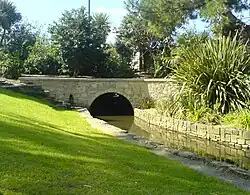 The River Bourne is a 7-kilometre (4.3 mi)[3] long river that flows through Poole and Bournemouth in Dorset. It originally reached the sea at Bournemouth, giving the town its name, but now, in normal circumstances, it flows directly into the combined sewer beneath the approach to Bournemouth Pier.[3] Its name derives from the Middle English word bourne, meaning a small river.[4] It also gives its name to the BCP Council ward of Alderney and Bourne Valley in Poole. Approximately 70% of the Bourne's drainage basin lies within the boundaries of the Borough of Poole.[5][6]
