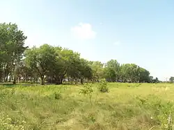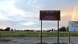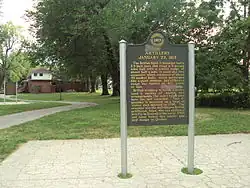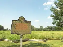 The River Raisin Battlefield Site was listed as a Michigan Historic Site on February 18, 1956, although the exact date at which the park was first organized is unknown. The location of the site is bounded by North Dixie Highway, the River Raisin, Detroit Avenue, and Mason Run Creek.[4][9] The Battle of Frenchtown is so named because it took place in and surrounding the Frenchtown Settlement (1784), on the River Raisin's north bank and within the present-day city limits of Monroe.[10] The area of conflict extended during the three days of battle several miles to the north and south of the current park site. After the battles, Frenchtown was gradually abandoned and the present-day city of Monroe developed from its downtown site 1.5 miles west and on the opposite bank of the River Raisin. The current park area encompasses some 40 acres (16 ha) of undeveloped land on Monroe's east side approximately one-quarter mile (0.4 km) west of Interstate 75. The area contains houses on the outer fringe along East Elm Avenue, and much of the area is occupied by urban development. The River Raisin Paper Company built a large paper mill on the site around 1911, which operated under multiple owners until 1995.[11]