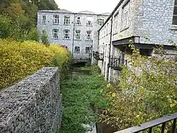 Litton Mill, at Slack Side, Litton was built on the site of an earlier mill, as Senior's map of 1611 shows a corn mill there. However, around 1782 it was replaced by a water-powered cotton spinning mill built by Ellis Needham and his partners. This lasted until 1870, when a fire destroyed most of it, although some of the 1780s buildings remain. The mill was rebuilt in 1874, and continued to operate until 1997. The site retains an undershot water wheel, of unknown date, which was fed directly from the river, without the benefit of a mill pond. There is also a chimney and flue, located higher up on the side of the dale, which is the only one of its type in good condition in the Peak District. Gas to light the mill and the nearby village was produced in a gas house, constructed between 1820 and 1840. By 2002, this was in a very dilapidated state, but has subsequently been repaired and altered. The mill building has been converted into flats.[34] A litle further downstream are the remains of a water-powered pump. It was used to pump spring water to a reservoir, was powered by a water wheel which was 4.9 feet (1.5 m) in diameter by 3.3 feet (1.0 m) wide, and was associated with Lees Rake and Burfoot Mines.[35]