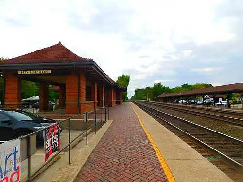 Riverside is a station on Metra's BNSF Line in Riverside, Illinois. The station is 11.0 miles (17.7 km) from Union Station, the east end of the line.[2] In Metra's zone-based fare system, Riverside is in zone 2. As of 2018, Riverside is the 100th busiest of Metra's 236 non-downtown stations, with an average of 493 weekday boardings.[1] A staffed station building is on the south side of the three tracks.