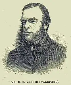 Mackie was the son of Robert J Mackie of St John's Wakefield. He was educated at Wesley College, Sheffield and became a partner in the firm of Robert Mackie and Sons, corn merchants. He was a J.P. for the West Riding of Yorkshire.[1] His brother was John Mackie, J.P. (1836–1891), benefactor of the Crigglestone area, whose wife dedicated the Church of St John the Divine, Calder Grove in his honour.[2] R.B. Mackie married Fanny Shaw daughter of William Shaw of Stanley Hall, Wakefield in 1852.[1]