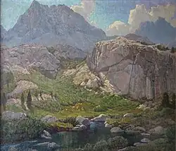 He painted in the Grand Tetons each summer from 1938 to 1941, and the Los Angeles Times described his Teton paintings as "impressive" and said that "the artist has approached his subject with a bold, strong technique combining the finest in art with a reality and geographic correctness which has excited the highest admiration from the rangers in charge of the district as well as art critics". He became friends with mountaineers Paul Petzoldt and Jack Durrance in the Tetons.[17]
