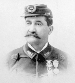 Robert H. Hendershot, about 1895, with GAR badges and "Drummer Boy" medal. Photograph from Gerry, H. E. Campfire Entertainment, 1903