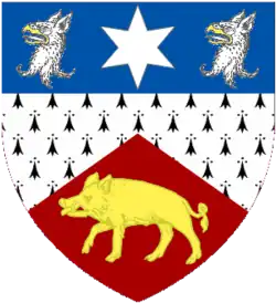Per chevron Ermine and Gules in base a boar passant Or on a chief Azure a star of six points Argent between two griffins' heads erased Proper.