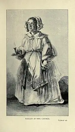 With his wife he managed the Lyceum Theatre from 1844 to 1847, putting on, among other productions, adaptations from the works of Charles Dickens; here he played the nurse Sarah Gamp in Martin Chuzzlewit, for which role he was coached by Dickens himself, Trotty Veck in The Chimes, and Mrs Caudle in Mrs Caudle's Curtain Lectures by Douglas Jerrold.[6] It was said of the 5' 2" red-headed Keeley "however he may multiply his characters, vary his dresses, his wigs, or his words, it is Robert Keeley, and nothing else".[7]