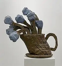 Throughout his career Kobayashi made free-standing sculptures as well as wall-mounted works. Some of these were toy-like objects such as a cat in a four-poster bed fashioned out of an old radio, a stool with sneakers on its four legs, and wooden puppets.[22] Others were more traditionally artistic, such as portraits of friends and relatives or flower arrangements. "Flowers Seeking Affection" (2002) is an example of the last named. A critic said, "within these flowers there is the charm in the uniqueness of each bloom gesturing with personality."