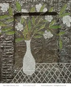 After he moved into the building that contained Moe's Meat Market, he began to work in sheet metal, making portraits and still lifes using metal obtained from discarded stamped ceiling tin and cans that had held olive oil, beer, or ground coffee.[23] These pieces, which a critic dubbed "clouages,"[7] were nailed into a wood frames and contained decorative patterns made of many tiny nails.[22] Critics saw them as strange and whimsical,[22] a kind of idiosyncratic folk art having a childlike quality.[3] One late piece in this style is "Nine White Flowers" of 2013. A critic noted that "despite the coldness one would expect from the medium of tin, Kobi’s work subtly suggests a gentle wit and a delicate touch. The rigid nature of the metal is softened into a suppleness of shape and color. The chill warms with the nimble diligence of his fingers guided with the expressiveness of his affectionate mind."[10]