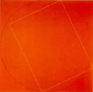 Mangold's early work consisted largely of monochromatic free-standing constructions displayed against the wall, such as Grey Window Wall (1964).[5] In 1968 he began employing acrylic instead of oil paint, rolling rather than spraying it on Masonite or plywood grounds. Within the year, he moved from these more industrially oriented supports to canvas.[6] In 1970 he began working with shaped canvases and within the year began brushing rather than spraying paint onto canvas. By the mid-1970s, Mangold moved on to overlapping shapes whose contours are formed by combinations of canvas edges and both drawn and implied lines.[7] A Rectangle and a Circle within a Square from 1975, in the collection of the Honolulu Museum of Art is an example of these subtle geometric relationships.