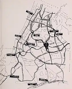 Caro's depiction of Moses's life gives him full credit for his early achievements, showing, for example, how he conceived and created Jones Beach and the New York State Park system, but also shows how Moses's desire for power came to be more important to him than his earlier dreams. Moses is blamed for having destroyed more than a score of neighborhoods by building 13 expressways across New York City and by building large urban renewal projects with little regard for the urban fabric or for human scale.[14] Yet the author is more neutral in his central premise: the city would have developed much differently without Moses. Other U.S. cities were doing the same thing as New York in the 1940s, 1950s, and 1960s; Boston, San Francisco, and Seattle, for instance, each built highways straight through their downtown areas just as Moses wished to do in New York.[14] The New York City architectural intelligentsia of the 1940s and 1950s, who largely believed in such proponents of the automobile as Le Corbusier and Mies van der Rohe, had supported Moses. Many other cities, like Newark, Chicago, and St. Louis, also built massive, unattractive public housing projects.[54][14] Caro also points out that Moses demonstrated racist tendencies.[55] These allegedly included opposing black World War II veterans' intentions to move into a residential complex specifically designed for these veterans,[56] and purportedly trying to make swimming pool water cold in order to drive away potential African American residents in white neighborhoods.[57]