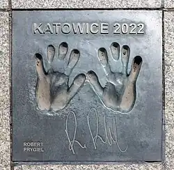 Hand prints and signature at the Avenue of Volleyball Stars, Katowice