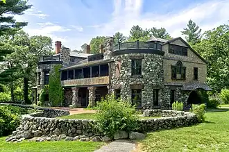 In 1866, Boston lawyer Robert Treat Paine Jr. and his wife Lydia (Lyman) commissioned architect Gridley James Fox Bryant to build a mansarded Second Empire summer house in Waltham. The house and its site were paid for by George Lyman, Lydia's father and owner of an adjacent summer residence, the Lyman Estate.[2] This house was deemed too small for the Paines and their seven children. In October 1883, Richardson and Olmsted made their first visit to the property to discuss relocating the house and expanding it. In July 1884, Olmsted and Richardson produced sketches for a new site atop a rocky ridge with sweeping views to the southeast. In the spring of 1885, construction began while the Paine family traveled to Europe with Phillips Brooks, a family friend and pastor of Trinity Church in Boston. When Richardson died at age 47 in April 1886, the commission was close to completion. The terrace and some interior finishes were completed over the summer.