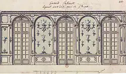 Born in Paris, Robert de Cotte began his career as a contractor for masonry, working on important royal projects between 1682 and 1685, when he was made a member of the Académie royale d'architecture and architect of the Court, ranking third in importance after Mansart's seldom-credited assistant François Dorbay.[3] On his return to France after a six-month sojourn in Italy (1689–1690), in the company of Jacques Gabriel,[4] he became the director of the Manufacture des Gobelins, where not only the famous tapestries, but also royal furnishings were produced; even designs made under his direction for wrought iron balustrading are to be found among the eight volumes of drawings for the Gobelins, and for other public and private commissions, conserved at the Cabinet des Estampes, Bibliothèque Nationale.[5] In 1699, when Mansart was made Surintendant des Bâtiments, a position otherwise invariably reserved for a noble layman, de Cotte became his second-in-command in an executive function, charged with overseeing all the files of drawings, the stocks of marble and other materials including those for the royal manufactures of the Gobelins and Savonnerie, with overseeing the bidding process with contractors and with liaison with the Académie, of which he was made a member that same year. Fiske Kimball, the chronicler of the Rococo, notes that there are no surviving drawings by de Cotte from this period, nor from the period after Mansart's death in May 1708.[6]