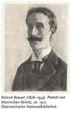Bocquet moved to Dresden in 1900 and whilst earning his living as a teacher of Music and Mathematics entered the city's bohemian artistic circle. His compositions date from 1902, writing virtuoso piano pieces and Lieder drawn from the poetry of Baudelaire, Hermann Hesse, Friedrich Nietzsche, Max Dauthendey and others.[3] The British composer Arnold Bax who had known Bocquet at the Royal Academy, spent some time with him during a visit to Dresden in 1906 and described him thus: Roland Bocquet was the writer of many very skilful but clearly Strauss-derived lieder. Noticeably handsome, black-haired and moustached, blue-eyed, straight of nose and with a peculiarly beautiful speaking voice, he'd been settled in Dresden for some years and spoke German like a native. He took himself rather Byronically, and posed as a blase cynic.[4]