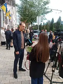 Roman Chervinsky gives an interview at the Shevchenko Court in Kyiv. His wife Olga listens. October 18, 2023