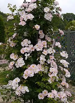 'Shropshire Lass' is a tall shrub rose, 5 to 8 ft (1.5–2.4 m) in height, with a 3 to 4 ft (0.91–1.22 m) spread.[2] It can be trained as a climbing rose, and can grow up to sixteen feet on a wall. It makes an excellent support for late-blooming clematis.[3] The rose has a mild fragrance. Its flowers are large, 4 to 5 in (100–130 mm), with a single to semi-double, saucer-shaped bloom form. 'Shropshire Lass' is a once-blooming rose during the summer, but flowers abundantly. Flowers open as a light pink and fade to white as they age. They have prominent gold stamens that fade over time to white. Leaves are thin and unattractive. The plant has many prickles on its thin stems.[1][4]