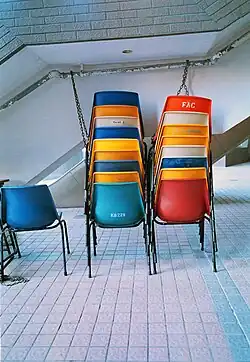 Robin Day designed a novel chair name Hillestak which used laminated wood[3] and the stackable chairs became popular for public buildings.[1] The partnership with Robin Day was very successful and in 1952 the Hille company set up showrooms in Mayfair where their modernist furniture could be displayed. Here they could host architects and interior designers. They won important contracts to supply prestige offices in London and the contract for the furniture for what would become Heathrow Airport. These chairs are still there (2014).[3] By 1953 they had five showrooms in Britain and another in Grenoble. In 1958 they designed the furniture for Gatwick Airport. Rosalind and her husband's company continued to support British design[1] and in 1963 Day designed another important chair this time in Polypropylene.[3] This polypropylene chair would become the world's most commercially successful chair.[3] Fred Scott designed the Supporto seating system in 1976 and it was launched in 1979.[4] Meanwhile, they won contracts for British embassies, the Istanbul Hilton and the Unesco building in Paris. Their successful British designs were licensed overseas including the rights to manufacture tens of thousands of chairs for the Mexico Olympics.[1]