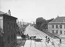 When Copenhagen's second central station was located at Axeltorv, the westbound trains crossed The Lakes on the embankment where Gyldenløvevej runs today and followed what is now Rosenørns Allé to present-day Julius Thomsens Plads where it split into a northbound and a westbound line.[2]