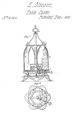 A major factor in Gleason's success was his ability to innovate, catering to a rising middle class clientele with a taste for mechanical gadgetry and the accessories of fine dining. His sons obtained patents for several products, including an ink stand[10] and a cake basket,[11] as well as several variations on the table caster, a device designed to hold condiment containers on the dining table.[12][13] The 1866 product catalog listed more than sixty types of casters. They were very popular items; in 1844, the Boston and Sandwich Glass Company, which made bottles and jars for casters, ordered 150 dozen caster frames.[14] One of the most elaborate casters concealed condiment bottles behind revolving doors and was cleverly marketed as the "Magic Caster"; an "improved" version added a bell and an egg stand.[15] Catherine Lanford Joy writes, "With its combination of mechanical ingenuity, artistic design, and mysterious effect, Gleason's Magic Caster is quintessentially Victorian."[16]