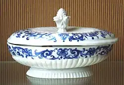 Rouen produced the first soft-paste porcelain in France, but only nine surviving soft-paste pieces are now generally attributed to Rouen, with a possible tenth.[8] Many other claimants have been reassigned to Saint-Cloud porcelain, which is often very similar.[9] None are marked, and an important piece of evidence is the coat-of-arms of the Norman lawyer Asselin de Villequiers on the mustard pot (illustrated below), now in the Sèvres museum. His arms are also found on Rouen faience.[10]