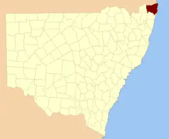 Rous County is one of the 141 cadastral divisions of New South Wales. It is located at the north-east tip of the state. It is bordered on the north by the border with Queensland and on the south by the Richmond River. It contains Lismore, Byron Bay and Murwillumbah. Note that Rous County should not be confused with Rous County Council, which despite the common name is a legally distinct entity, covering a separate (albeit overlapping) geographical area, the Rous county district.