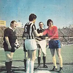 McFarland (right) captaining Derby County in 1973, here with Salvadore of Juventus before the semi-final round of the European Cup in Turin, Italy.