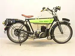 In 1914 Enfield supplied large numbers of motorcycles to the British War Department and also won a motorcycle contract for the Imperial Russian Government. Enfield used its own 225 cc two-stroke single and 425 cc V-twin engines.[23] They also produced an 8 hp motorcycle sidecar model fitted with a Vickers machine gun.