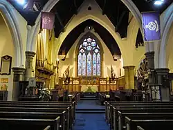 The organ was built by Brindley and Foster in 1900, and is the second instrument to stand in the Church. It has 1749 pipes and three manuals and pedals and eighteen speaking stops, with provision for another twenty-two stops which have subsequently been added plus an additional three. The gilded pipes on the north aisle screen are only dummies, and are not connected to the organ in any way.[14]