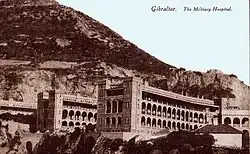 The British Military Hospital Gibraltar opened c. 1903 to provide medical care for local sailors and British military personnel in Gibraltar.[1][2][3] It was located on Europa Road in the British Overseas Territory of Gibraltar at the southern end of the Iberian Peninsula.[4][5] It included three three-story buildings, with a capacity of about three hundred beds.[3][4] The light blue colour of its exterior gave the hospital its nickname, the Wedgwood Castle.[1][4] Visitors to the hospital included Queen Alexandra in 1905 and King George V in 1912.[6]