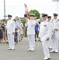 The detachment left on 27 November 1951, but the band remained in New Zealand to serve as the official RNZN band, being was elevated to the status of a class A band under the command of a commissioned bandmaster the following year. In 1953 the band was transferred to HMNZS Philomel from Bellona and was designated as the New Zealand Station Royal Marines Band under the command of the Naval Officer in Charge, Auckland, becoming the representative band of the RNZN instead of a single ship. Duties included participating in a full-scale version of The Mikado staged by HMNZS Irrirangi, concerts around New Zealand, and the 1953 Presentation of the Queen's Colour of the RNZN by Queen Elizabeth II. During the 1953-54 Royal Tour of New Zealand, the band was posted to the cruiser HMNZS Black Prince that accompanied the Royal Yacht.[3][4] In 1959 approval was given for the formation of the RNZN Band by the Naval Board to replace the New Zealand Division Marine Band when their service in the country ended. On 20 March 1960, a service was held for the band at the Chapel of St Christopher. A plaque of the crest of the City of Auckland was presented to the bandmaster Lieutenant C.G. McLean. The band was formally discharged from New Zealand service on 6 April 1960. In 2012, it was one of three bands spared in the government cutback on military bands.[5]
