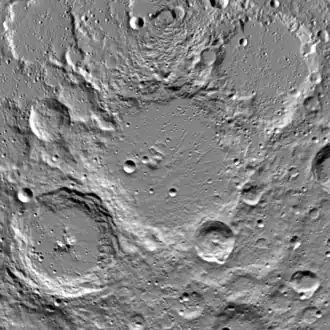Rozhdestvenskiy is a large lunar impact crater that is located on the far side of the Moon, within one crater diameter of the north pole. It lies sandwiched between the craters Hermite along the eastern rim, and Plaskett which intrudes slightly into the west-southwestern rim. Just on the opposite side of the pole is the crater Peary.