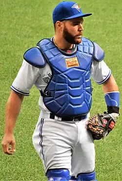 On November 18, 2014, the Toronto Blue Jays announced that they had signed Martin to a five-year, $82 million contract.[2] Early in spring training, manager John Gibbons told reporters that Martin would be R. A. Dickey's catcher during practice and in preseason games, to give him the opportunity to practice catching Dickey's knuckleball.[31] Martin received a standing ovation from the fans at Olympic Stadium on April 3, as the Blue Jays played their final two spring training games in Montreal for the second consecutive year.[32] On April 19, 2015, Martin caught Jeff Francis in his debut for the Blue Jays, and in doing so formed the first all-Canadian battery in franchise history.[33] On June 2, Martin stole home off the back end of a double steal, and became the first Blue Jay to steal home since Brett Lawrie did so in 2012.[34] Martin established a new career-high in home runs on September 26, hitting his 22nd of the season to aid the Blue Jays to a 10–8 win over the Tampa Bay Rays.[35] He ended the 2015 regular season with a .240 batting average, 23 home runs, and 77 RBI in 129 games.[36] He led the major leagues in passed balls, with 19.[37] Martin was announced as a finalist for the catcher Gold Glove award, along with Salvador Pérez and Jason Castro.[38]