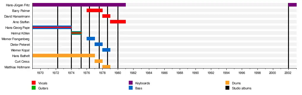 Members of the original band were Hans-Jürgen Fritz (aka Jürgen Fritz) on keyboards, Werner Frangenberg on bass and vocals, and drummer-percussionist-lyricist Hans Bathelt. However, that line-up would be in a constant state of flux over the band's career, with each album featuring at least one different member.