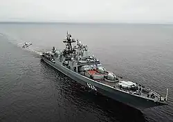 In 2012 the destroyer escorted commercial convoys as part of the anti-piracy mission in the Gulf of Aden.[4] In July 2012, Vice-Admiral Kulakov led a flotilla of the Northern Fleet to the Eastern Mediterranean to conduct naval drills, close to the Syrian coast.[5] In August 2012 she paid a five-day visit to Portsmouth Naval Base, England. In September 2012 Vice-Admiral Kulakov visited Cobh, Ireland.