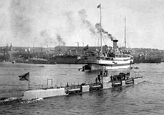 In March 1916, the steamer Dubrovnik was torpedoed by Tyulen but still kept going, and it was finished off by Morzh.[2][10] In May 1916, the submarine was damaged during an attack by a Turkish plane,[1] and in June Morzh captured the Turkish sailing ship Belouzar, which was transporting oil.[15] After the February Revolution in 1917, the Black Sea Fleet and its submarines continued to be active and the Russian Provisional Government intended to eventually land ground troops along the Anatolian coast.[16] While on a patrol that took place in May 1917, Morzh was lost at sea with its entire crew of 42 men, most likely from a mine near the Bosporus.[2][1][17]