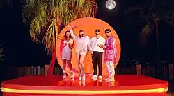From left to right, Megan Thee Stallion, Lisa, DJ Snake, and Ozuna dancing together in a tropical setting.
