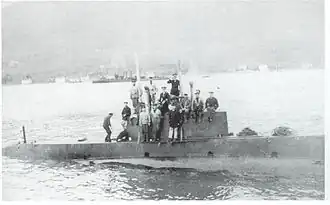 After SS-3's March 1911 launch, Whitehead tried to sell SS-3 to the Austro-Hungarian Navy, but because the evaluation of the first two U-5-class boats was still underway, they declined to purchase.[2] Over the next three years Whitehead attempted to sell the boat to the navies of Peru, Portugal, the Netherlands, Brazil, and Bulgaria, before the Austro-Hungarian Navy rejected an offer for the second time.[2] With the outbreak of war, however, the Austro-Hungarian Navy purchased the unsold submarine to quickly bolster its fleet.[10] Although provisionally assigned the designation U-7, the submarine was commissioned as SM U-12 on 21 August 1914,[5] with Linienschiffsleutnant Egon Lerch in command.[3] U-12's activities over the early part of the war are not reported, but the boat's armament was augmented by a 3.7 cm (1.5 in)/23 quick-firing (QF) deck gun in November 1914. Sister boat U-5 had her first radio receiver installed at the same time her deck gun was added, but it is not reported whether U-12 did as well.[1]