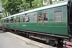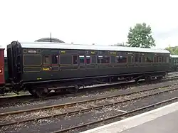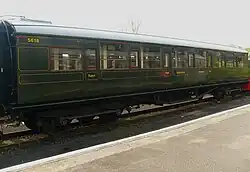 The policy under which the Southern Railway operated set trains continued into the Southern Region of British Railways; sets were disbanded and created as BR tried to create a new timetable.[2] Since 1949, the official livery for all main line coaches had been crimson and cream, in seven years the whole of the Southern Region fleet should be crimson and cream but that wasn't the case as many sets were still in Southern Railway malachite green.[2] In 1959, as the Kent Coast electrification scheme was completed most restriction '0' were withdrawn at the same time. This decline continued as BR had more modern Bulleid and Mark 1 coaching stock until 1967 where the last was withdrawn.[2] Many Maunsell coaches were sold by BR to heritage railways were they restored and operated.