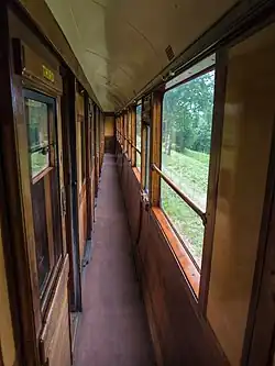 In 1925, the first order was placed for the first Maunsell carriage. The coaches were 59 ft long with a width of 9 ft 3 in and a height of 12 ft 4 in.[4] The bogies were SR built, with an 8 ft wheelbase.[5] The third class compartments were 6 ft 3 in wide seating four passengers per side, while the first class compartments were 7 ft 1 34 in wide and seated three passengers per side.[2]